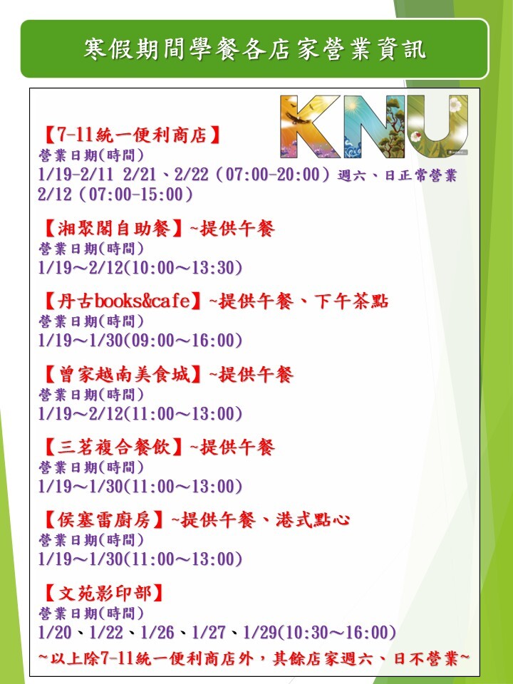 【總務處公告】1141寒假期間學餐各櫃位及店家營業資訊